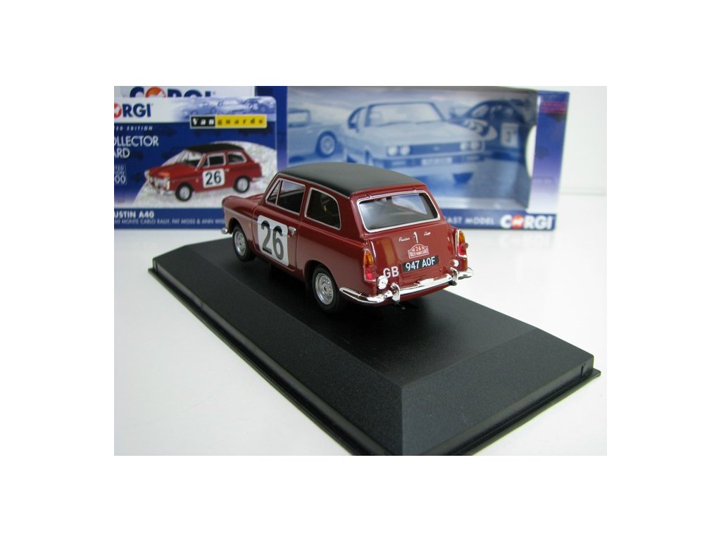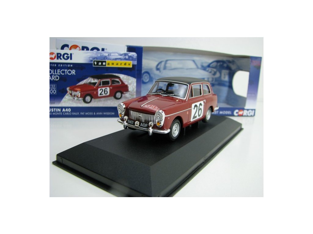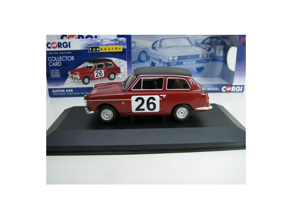 Kovový limitovaný sběratelský model s plastovými díly. Austin A40 Rallye MC 1960 No.26 Moss 1:43 Corgi Vanguards. Délka modelu je 10 cm. Model je upevněn šroubkem k podstavci, v plastové vitrínce. VA11209