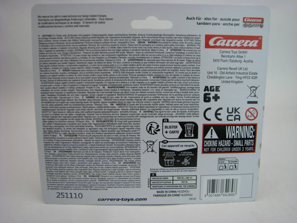 Plastové auto pro autodráhu řady Carrera GO!!! v měřítku 1:43. Auto obsahuje dvojité kontaktní kartáčky, magnet a vodící lištu.