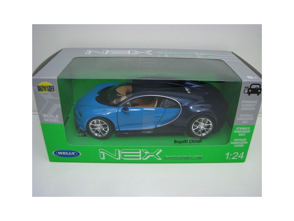 Kovový model s plastovými díly. Bugatti Chiron Blue/Blue 1:24 Welly. Model má otevírací kapotu, dveře a natáčecí kola. Délka modelu je 18,5 cm. Model je skladem ihned k odeslání, nebo osobnímu převzetí na prodejně v Děčíně, kde Vás rádi uvítáme.
