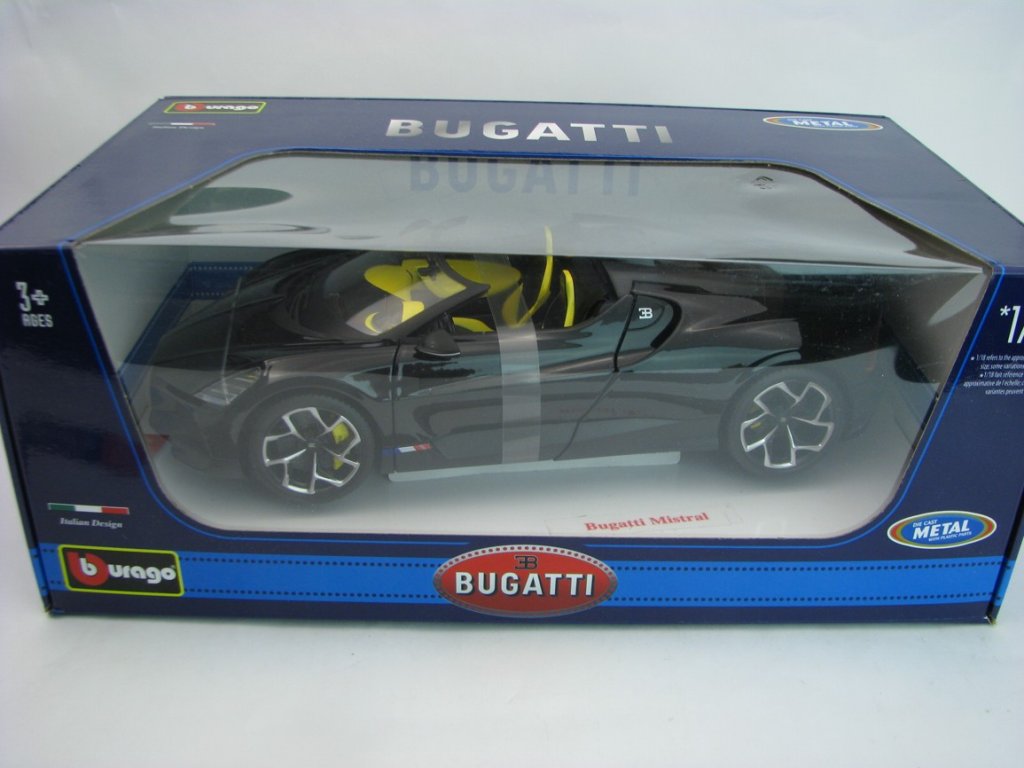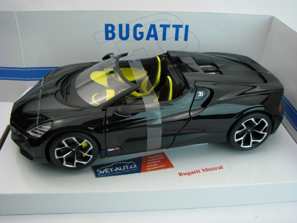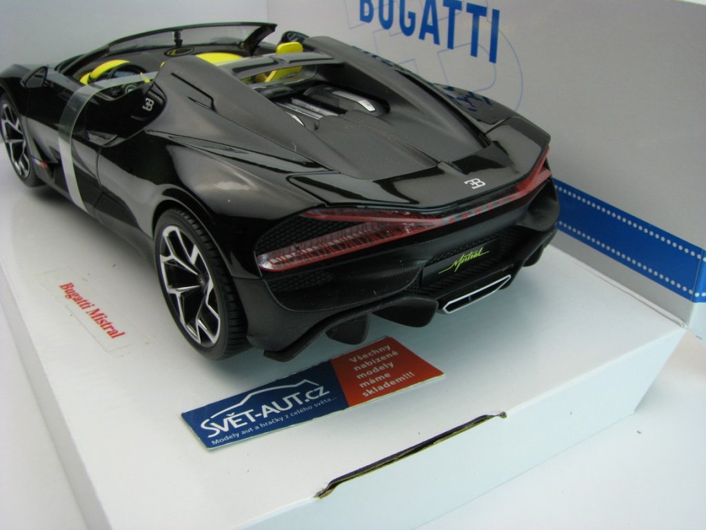 Bugatti W16 Mistral Cabriolet Black 1:18 Bburago 11051. Délka 25 cm. Otevírací dveře a kapota. BB-11051B