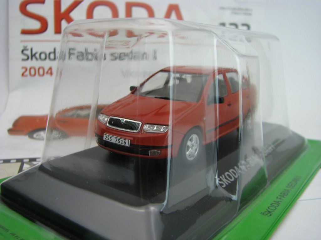 Kovový model s plastovými díly. Časopis 122 s modelem Škoda Fabia Sedan I 1:43 DeAgostiny. K modelu je možno přikoupit plastovou vitrínku, která přesně pasuje na podstavec. ATL-KSV122