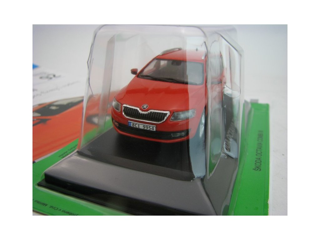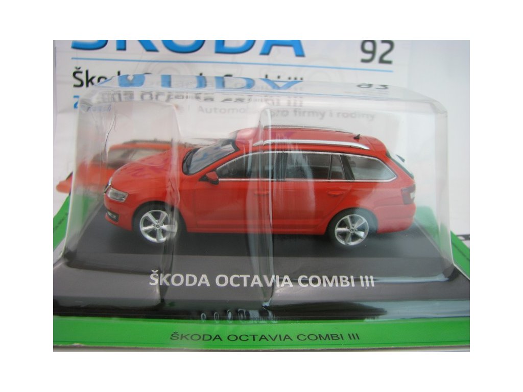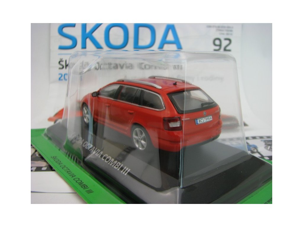 Kovový model s plastovými díly. Časopis 92 s modelem Škoda Octavia Combi III 2013 Red 1:43 Atlas Deagostini. Délka 11 cm. K modelu je možno přikoupit plastovou vitrínku, která přesně pasuje na podstavec.