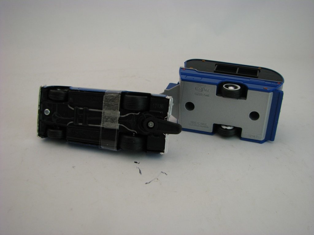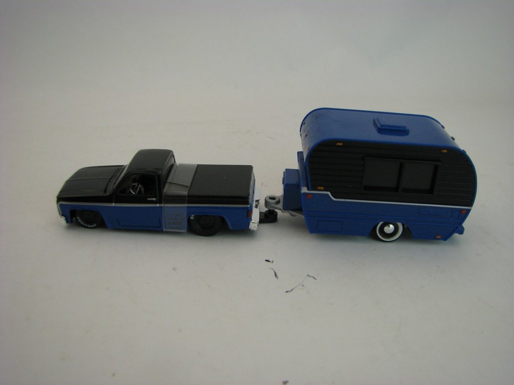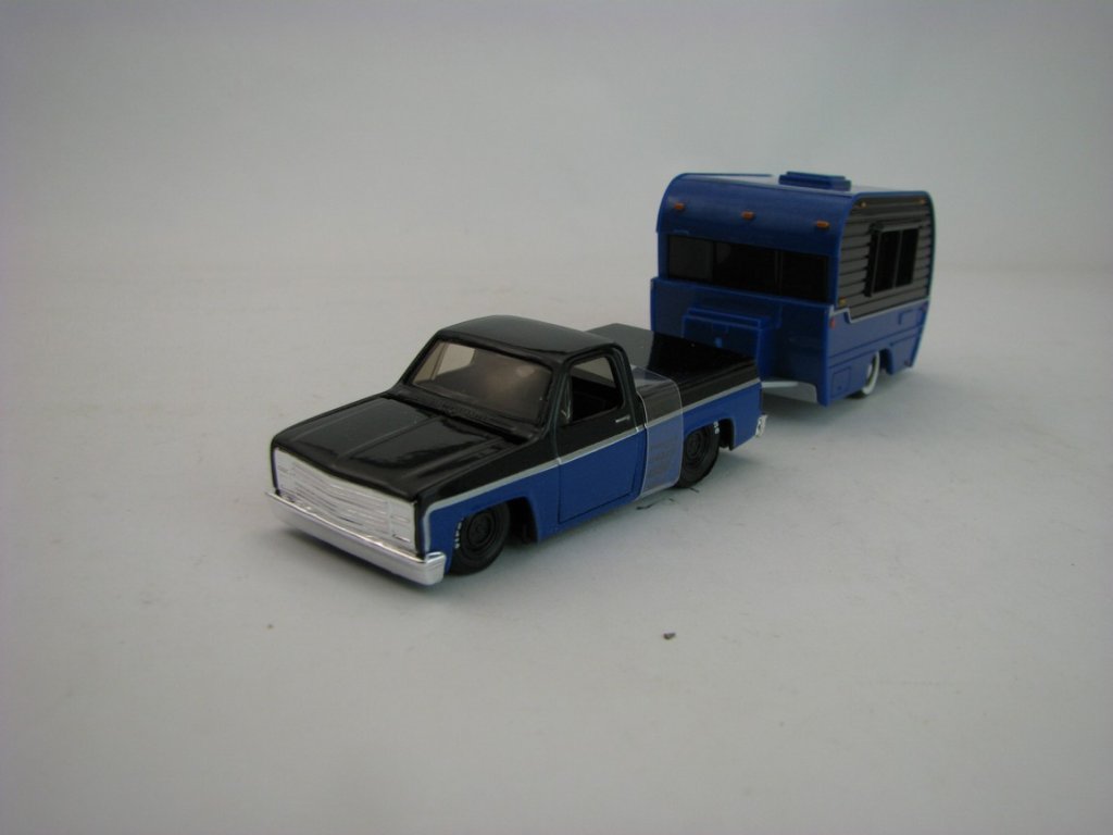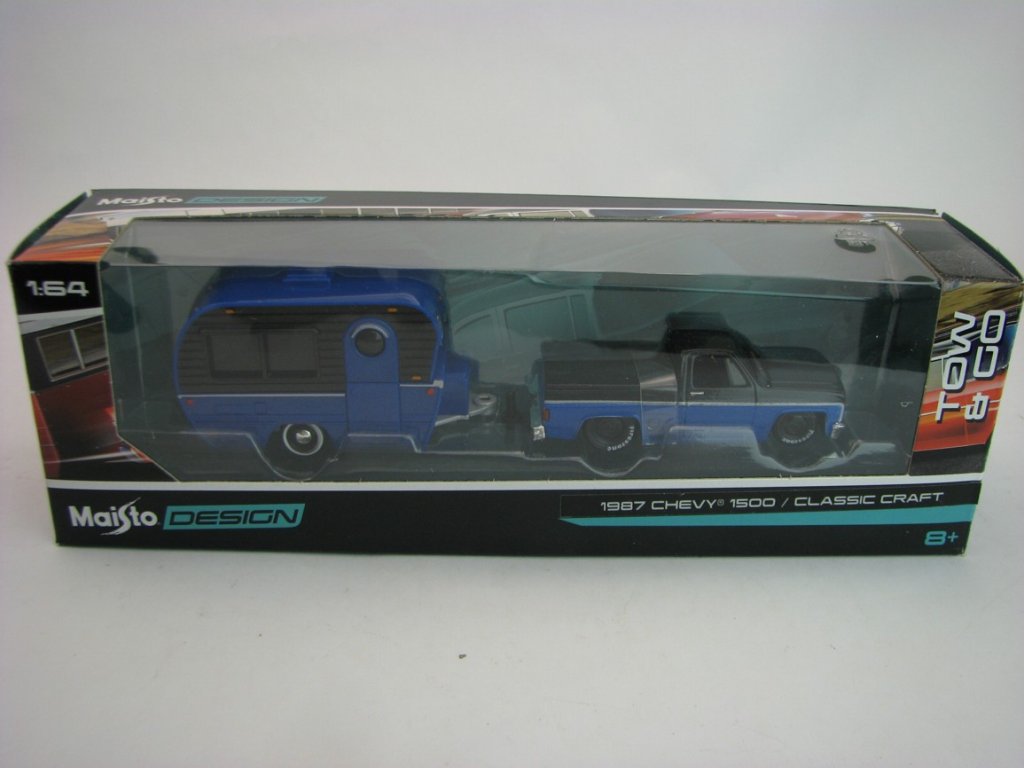 Kovový model s plastovými díly. Chevrolet Pick Up 1500 1987 a Caravan Classic Craft Blue 1:64 Maisto 11368. Délka soupravy je 15 cm. MST11368