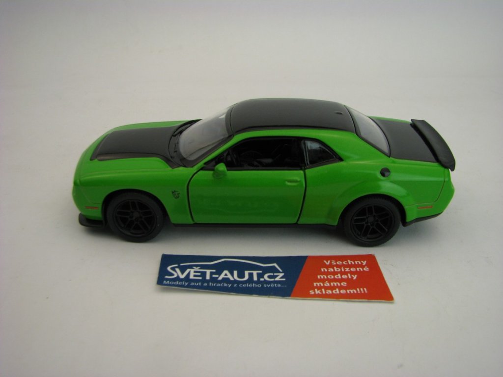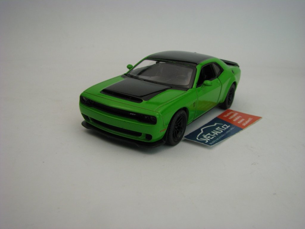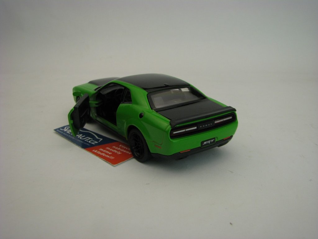 Kovový model na zpětné natahování. Otevírací dveře. Délka 12,5 cm. Dodge Challenger SRT Demon Green 1:40 Kinsmart
