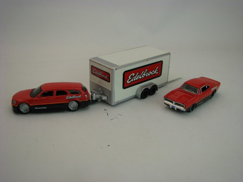Dodge Magnum R/T 2006 s přívěsem Edelbrock a Dodge Charger R/T Team Haulers 1:64 Maisto 11404. Kovové modely s plastovým přívěsem. Délka soupravy 18 cm. MST11404