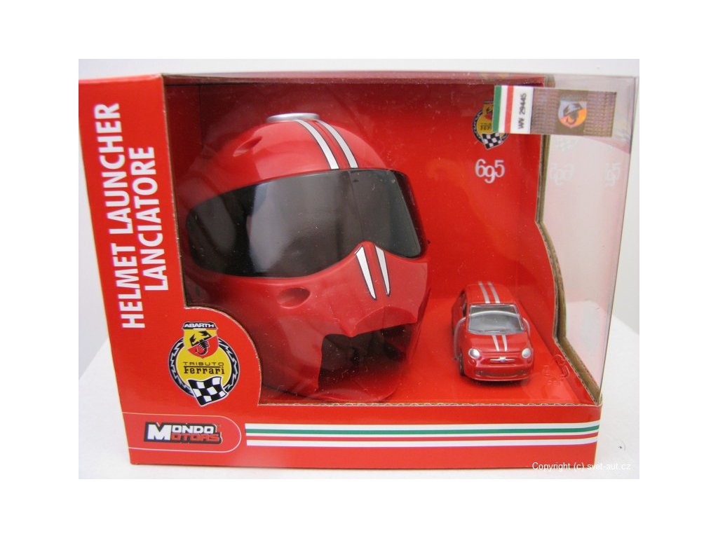 Kovový model Fiat 500 Abarth 1:64 a vystřelovací helma Mondo Motors. Délka modelu je 5.5 cm. Výška helmy je 9 cm.
