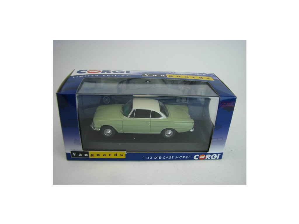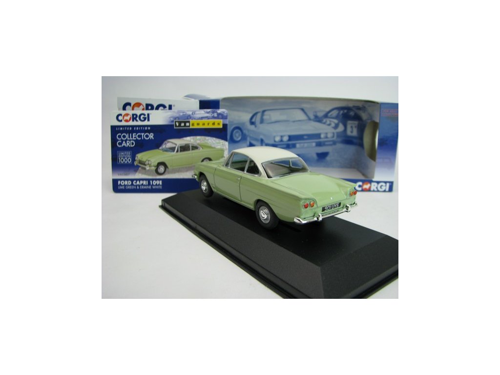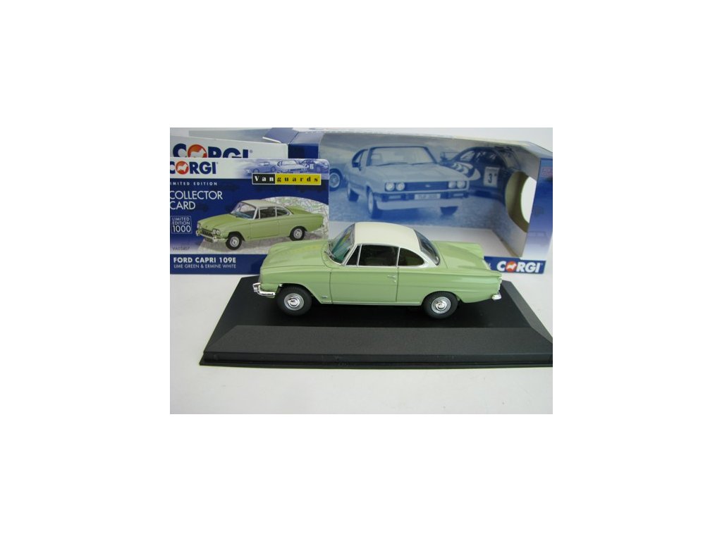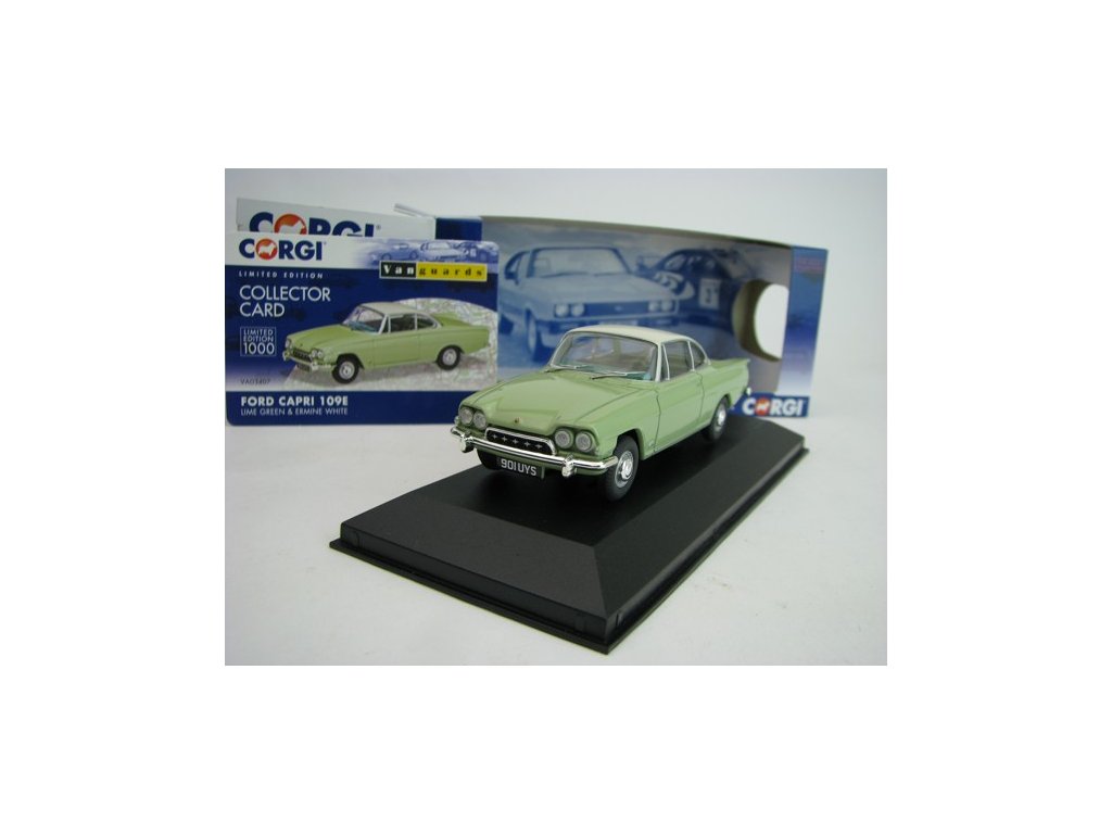 Kovový limitovaný sběratelský model s plastovými díly. Ford Consul Capri 109E Lime Green 1:43 Corgi Vanguards 03407. Délka modelu je 9,2 cm. Model je upevněn šroubkem k podstavci, v plastové vitrínce.Diskuze