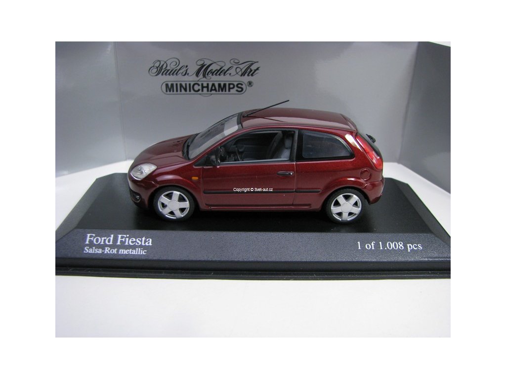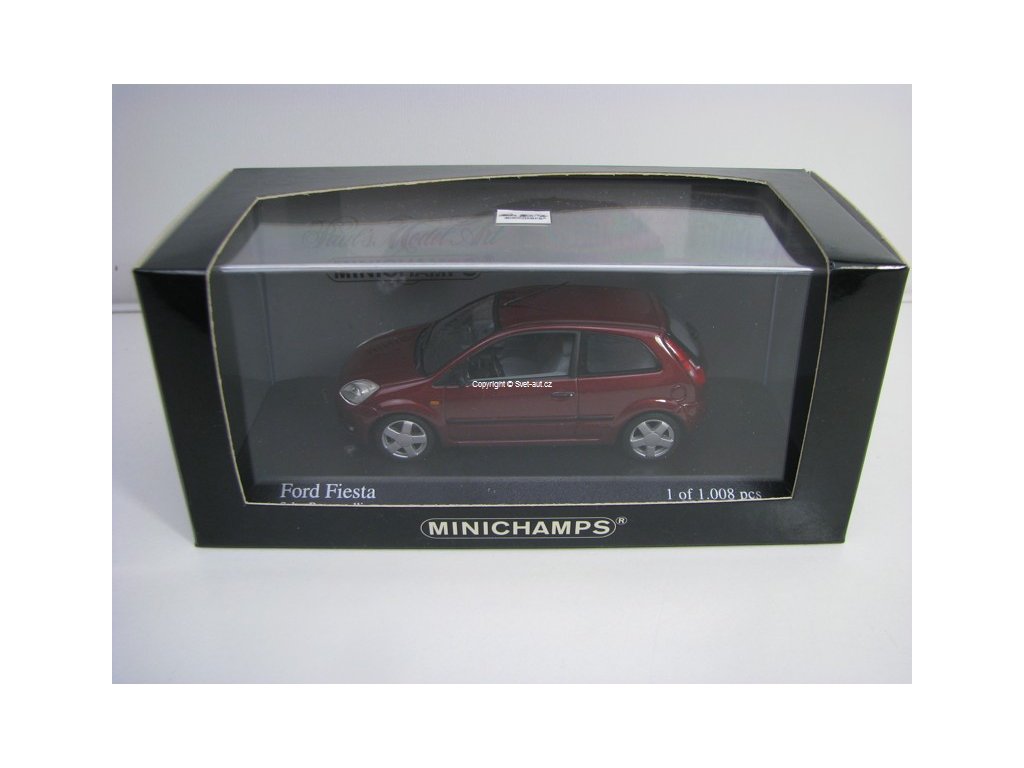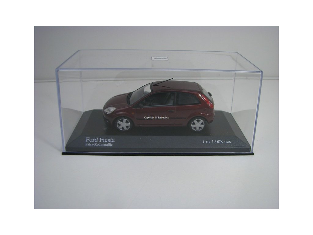 Kovový model s plastovými díly. Ford Fiesta 2002 3 doors salsa-rot metallic 1:43 Minichamps. Limitovaný model 1 z 1008 ks. Délka modelu 9,5 cm. Model je přišroubován na podstavci v plastové vitrínce.Doplňkové parametry