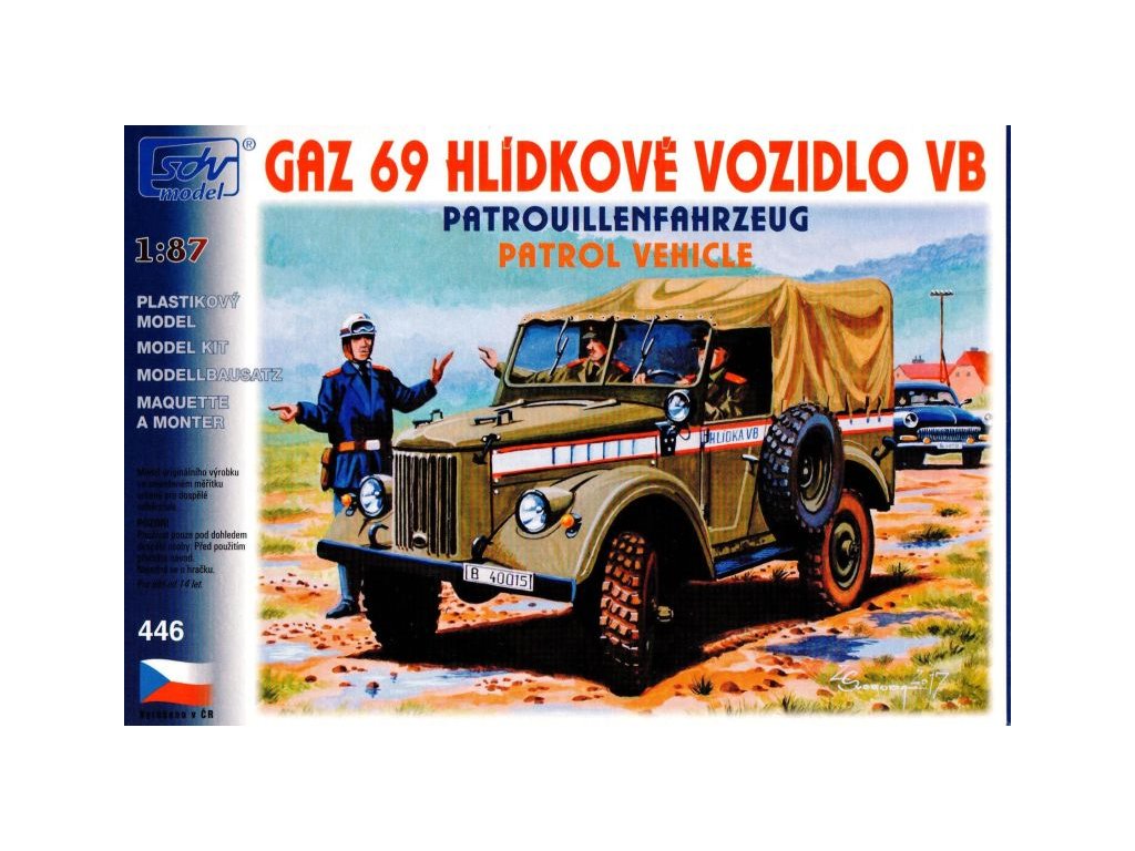Plastiková stavebnice na slepení. Gaz 69 Hlídkové Vozidlo VB 1:87 SDV 446. Stavebnice obsahuje probarvené plastikové výlisky na sestavení modelu, kovové osičky a sadu obtisků. Lepidlo ani barvy nejsou součástí dodávky.