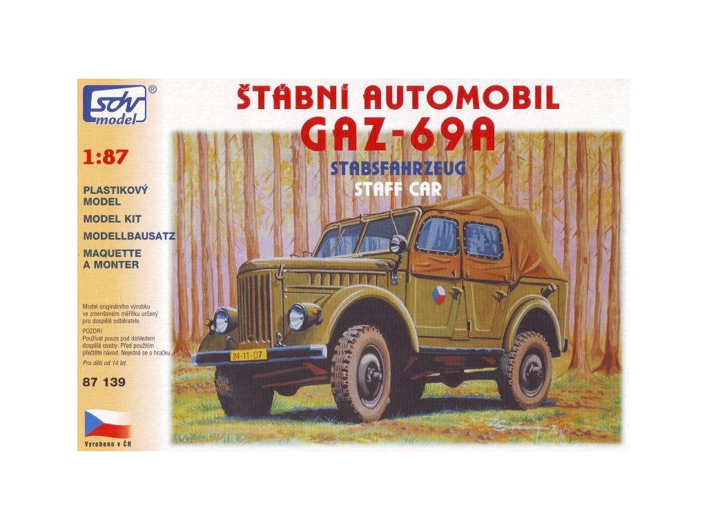 Plastiková stavebnice na slepení. Gaz 69A Štábní automobil kit 1:87 SDV 87139. Obsahuje probarvené plastikové výlisky na sestavení modelu a sadu obtisků. SDV87139 EAN:8592792871392
