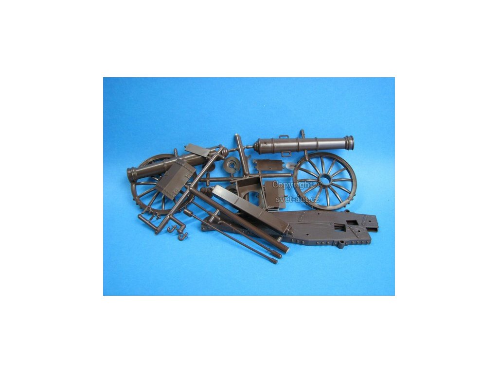 Plastiková stavebnice kanónu Napoleon v měřítku 1:18, délka postaveného modelu 18 cm, šířka 13 cm.