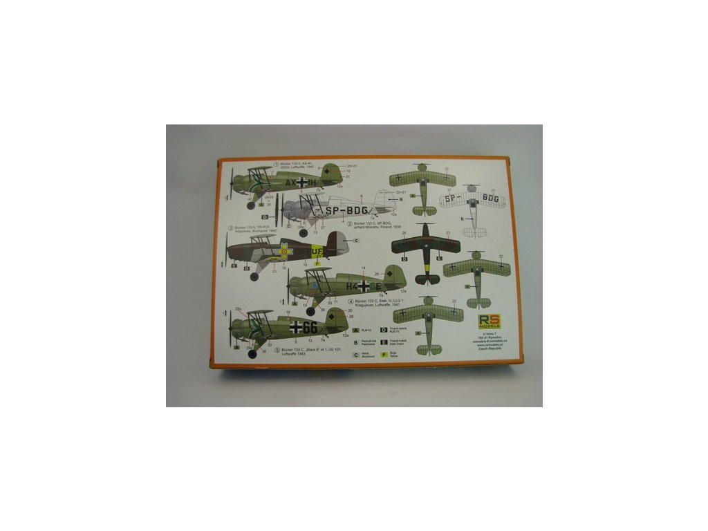 Letadlo Bucker 133 A/C Jungmeister stavebnice 1:72 RS Models. Bücker Bü 133 Jungmeister byl cvičný dvouplošník určený k nácviku akrobacie vyráběný od druhé poloviny 30. let 20. století v Německu. Vznikl vývojem z typu Bücker Bü 131 Jungmann. V Německu sloužil u Luftwaffe jako hlavní typ pro výcvik letecké akrobacie.Doplňkové parametry