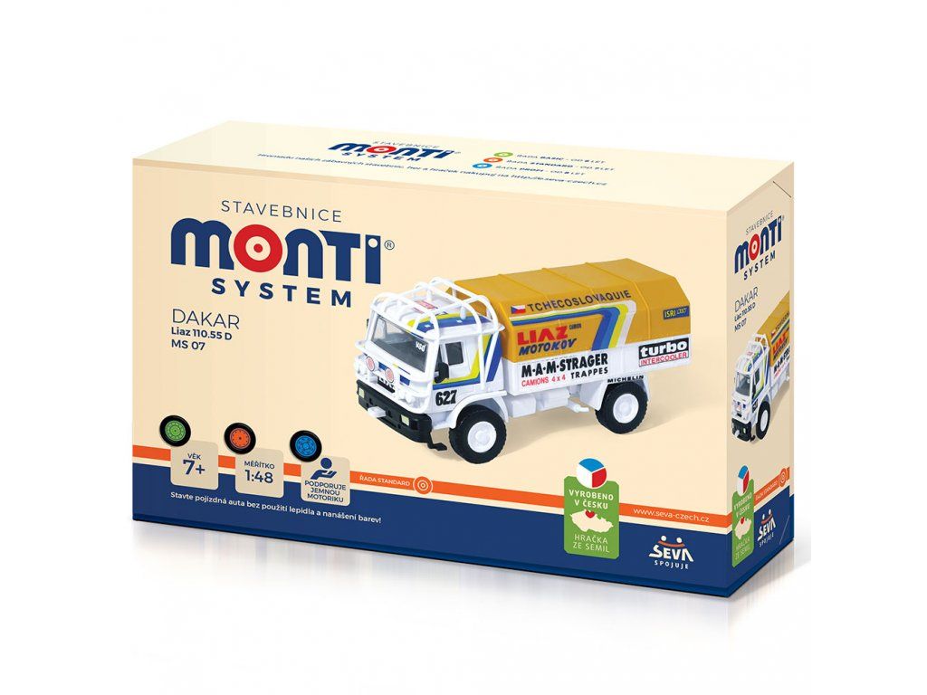 Plastiková stavebnice Liaz Dakar 1:48 SEVA Monti System 0103-07. K sestavení není potřeba lepidlo a barvy. Předností je rychlá montáž. Největší výhodou těchto stavebnic je, že k sestavení modelu autíčka nepotřebujete žádné lepidlo a barvy. Jednotlivé dílky jsou tak důmyslně vyrobeny, že s pomocí různých zacvakávacích zámků, úchytů a dalších pružných mechanismů sestavíte model bez jediné kapky lepidla. Vše do sebe jen zacvaknete nebo zasunete. Výsledkem je funkční model s úžasnými detaily, který je dokonalou replikou skutečné předlohy. Jednotlivé dílky jsou lisovány již barevné, takže nemusíte nic barvit. Navíc jsou některé dílky pochromované a u nových Monti Systémů mají některé stavebnice pro ještě realističtější vzhled gumová kola. V každém balení naleznete také samolepky, kterými si složený model můžete polepit. Věk +6 Stavebnice je na prodejně v Děčíně, připravena k okamžitému odeslání, nebo osobnímu převzetí. MS0103-7