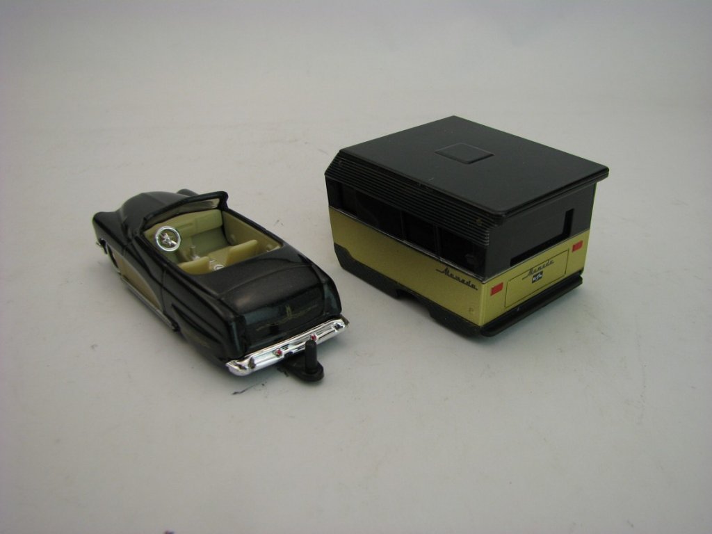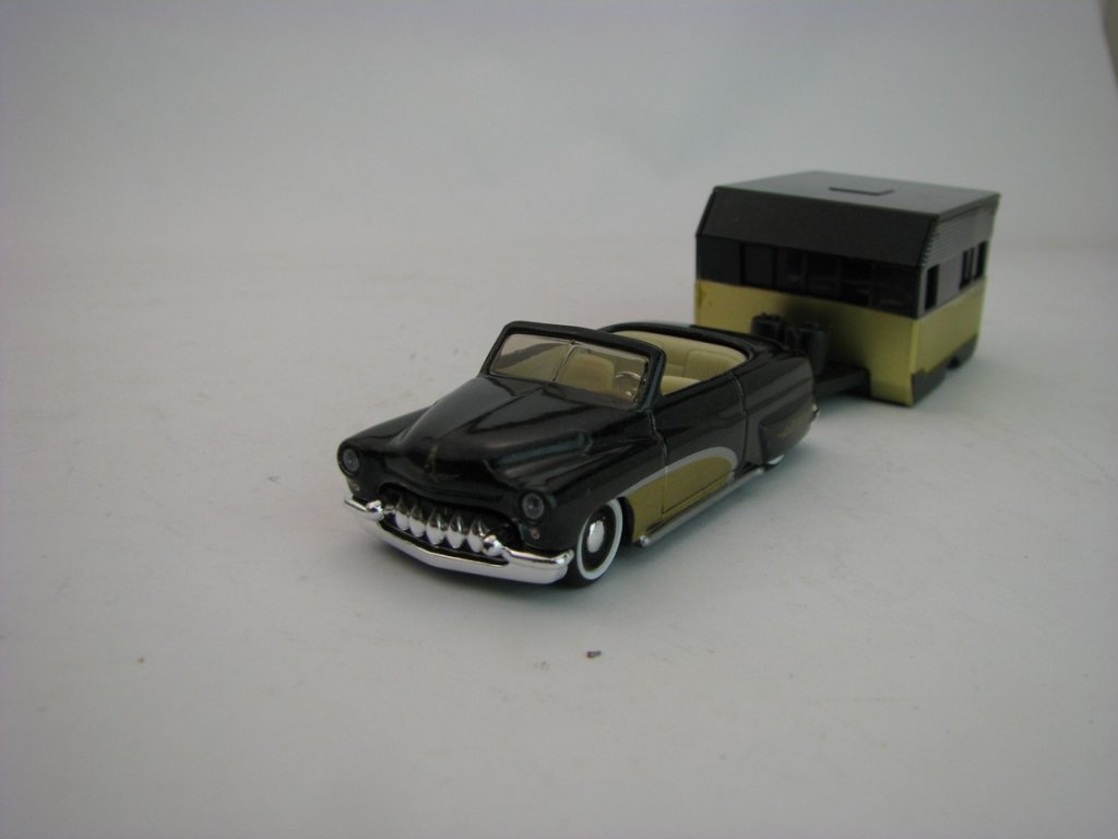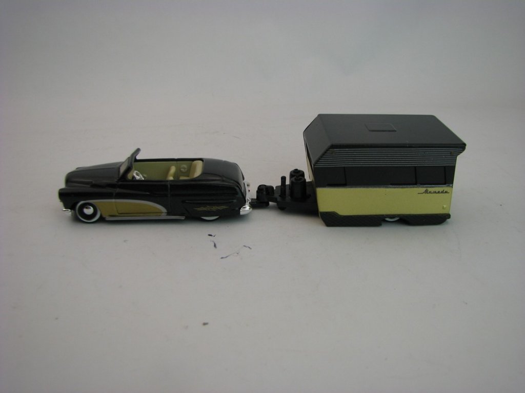 Kovový model s plastovými díly. Mercury 1950 a caravan Alameda Trailer Black 1:64 Maisto 11368. Délka soupravy je 15 cm. MST11368