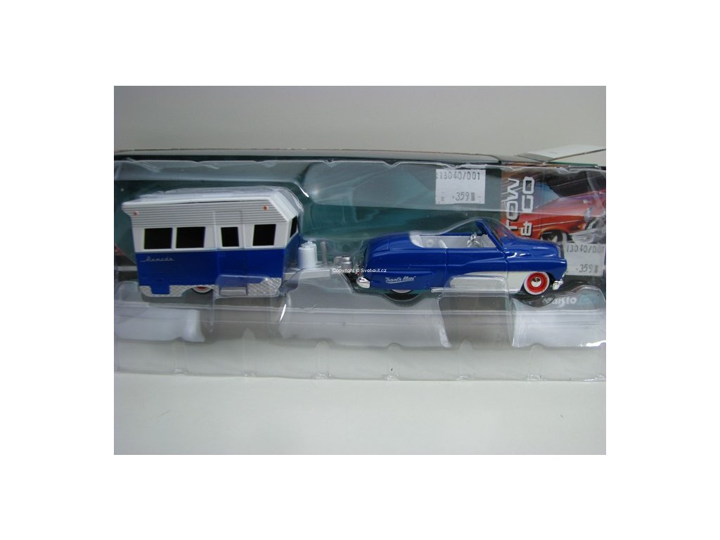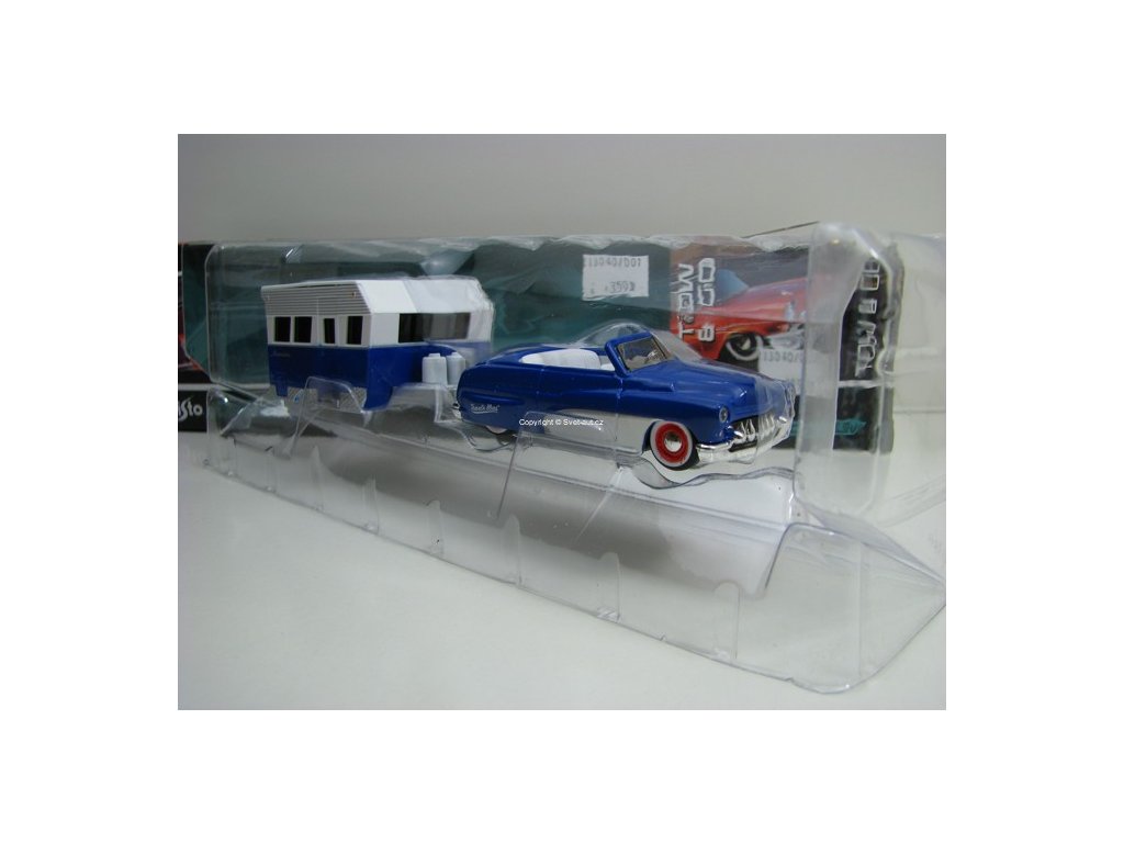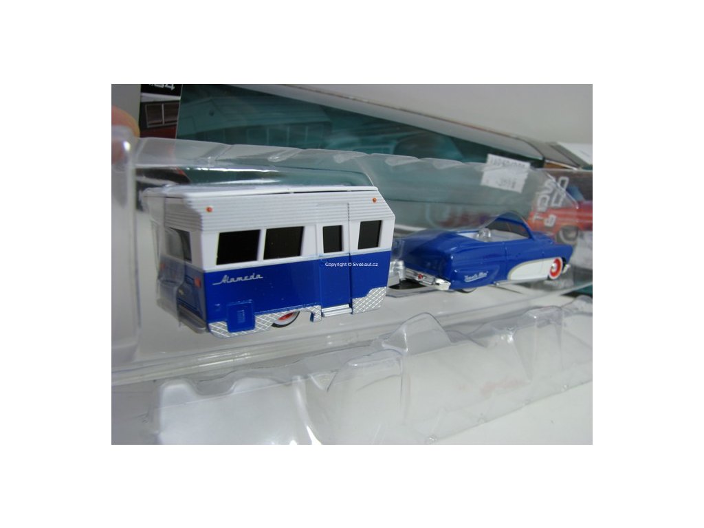 Kovový model s plastovými díly. Mercury 1950 a caravan Alameda Trailer Blue 1:64 Maisto 11368. Délka soupravy je 15 cm. MST11368