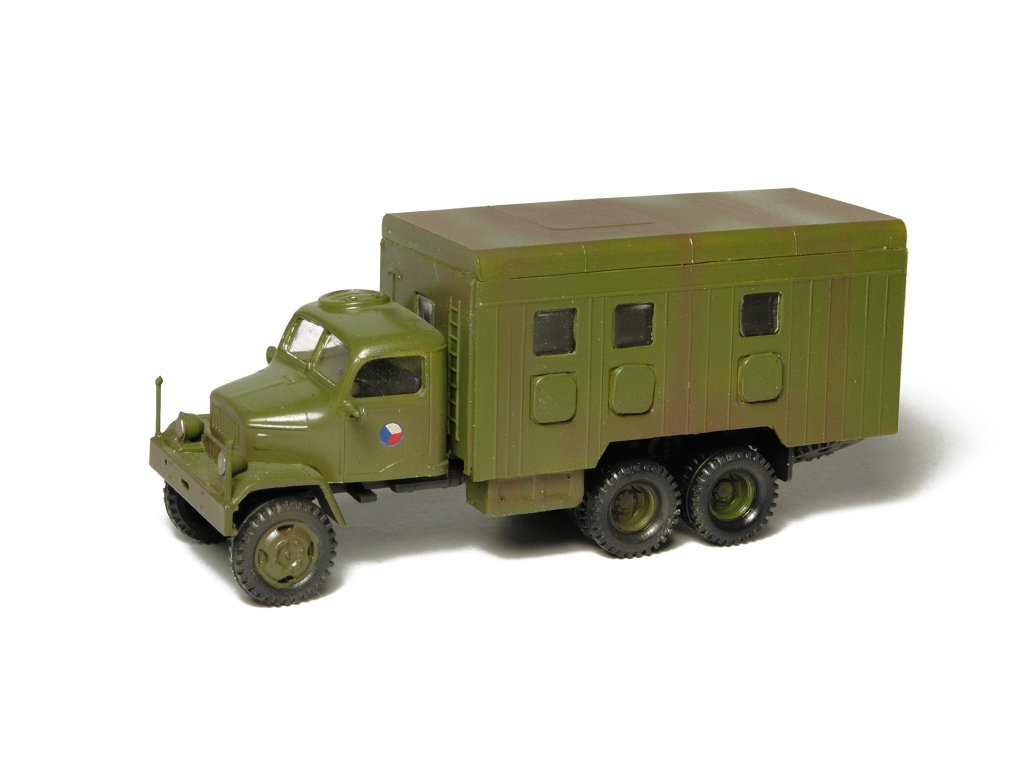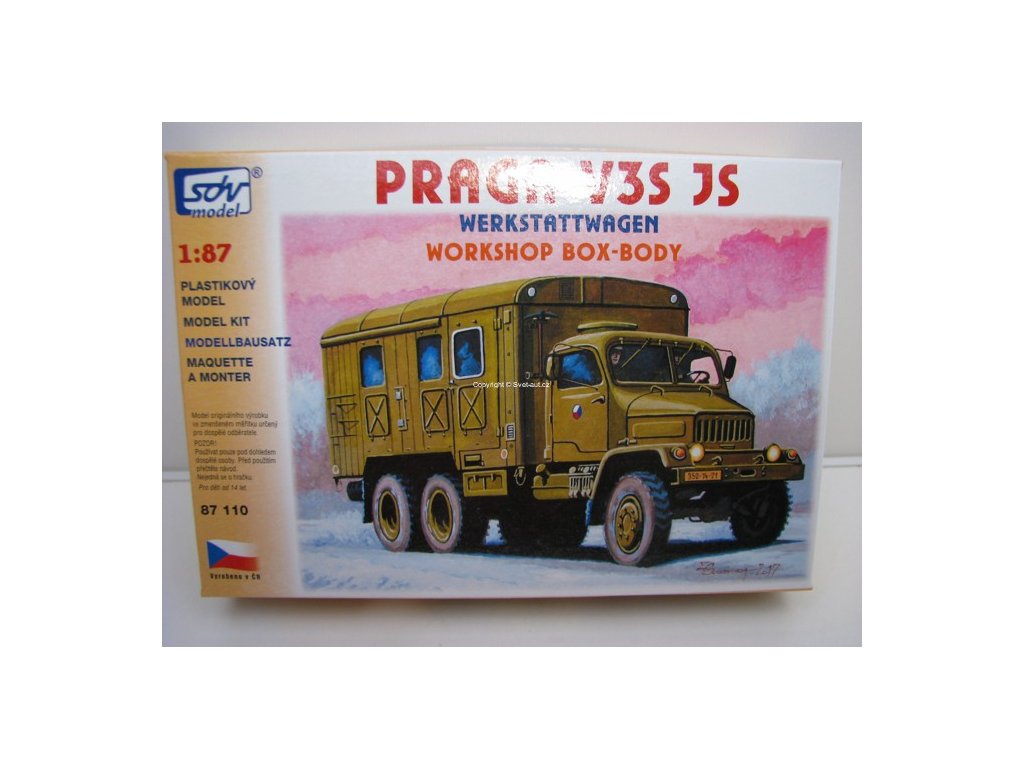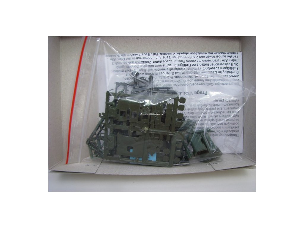 Plastiková stavebnice na slepení. Praga V3S JS stavebnice 1:87 SDV 87110. Kompletní plastiková stavebnice vojenské jednotné skříně. Obsahuje probarvené plastikové výlisky na sestavení modelu, kovové osičky a sadu obtisků ČSLA, AČR a ASR.