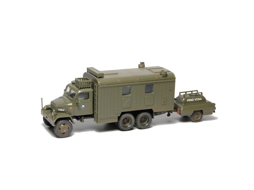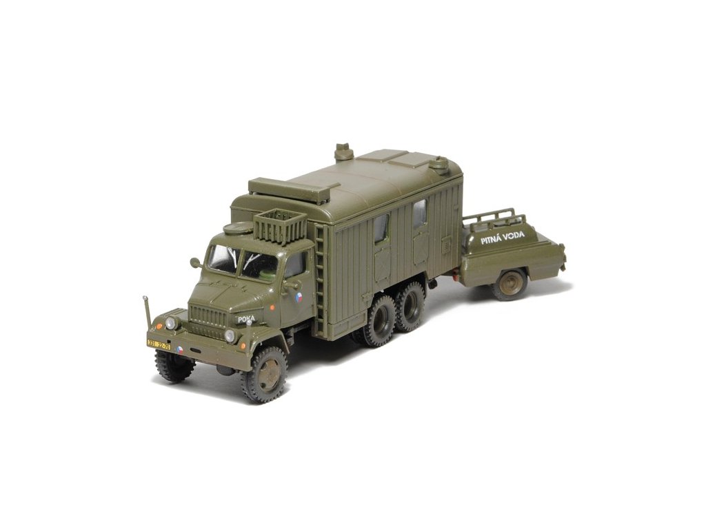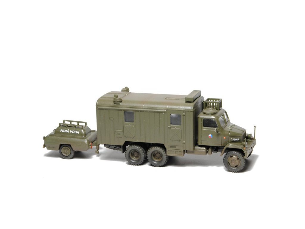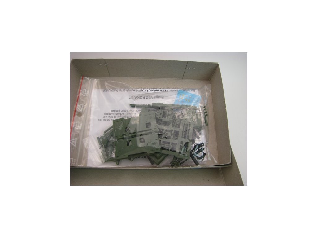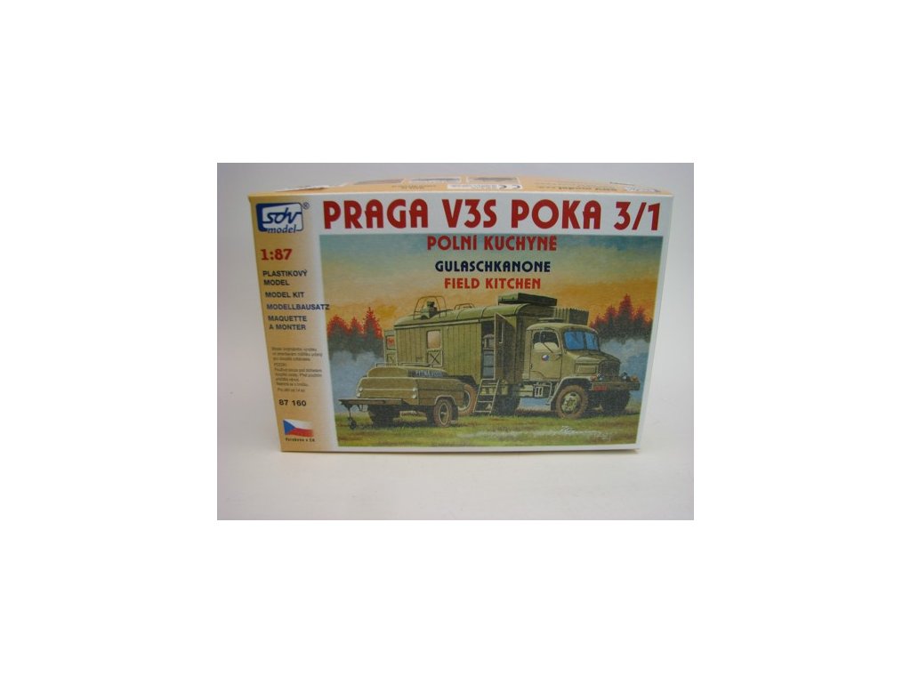 Kompletní plastiková stavebnice vojenské polní kuchyně. Obsahuje probarvené plastikové výlisky na sestavení modelů, kovové osičky a sadu obtisků ČSLA, AČR a ASR. Stavebnice je přepracována a obsahuje výlisky z nových forem.