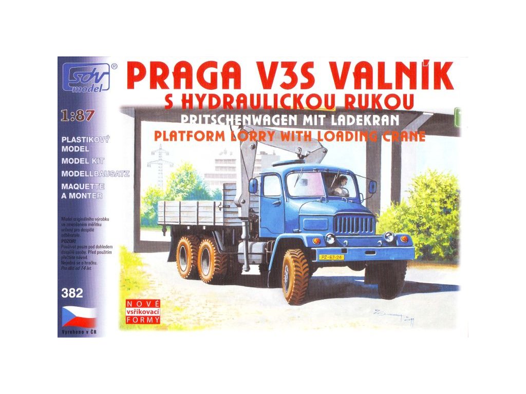 Plastiková stavebnice Praga V3S valník s hydraulickou rukou 1:87 SDV. Stavebnice je lisována v barvách modelu a součástí jsou i potisky. Není nutné ji tedy stříkat, nebo natírat. Lepidlo ani barvy nejsou součástí stavebnice.