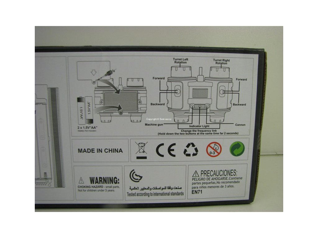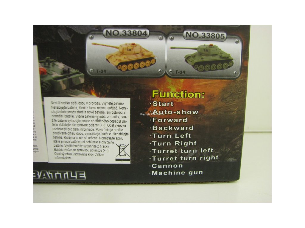Plastový RC model. RC model Tank T34 s akumulátorem 27MHz 1:32 Zegan. Součástí balení je dobíjecí akumulátor a adaptér. Do dálkového ovládání je potřeba dokoupit 2ks tužkové baterie AA. Délka tanku bez děla je 14 cm. PRC105191