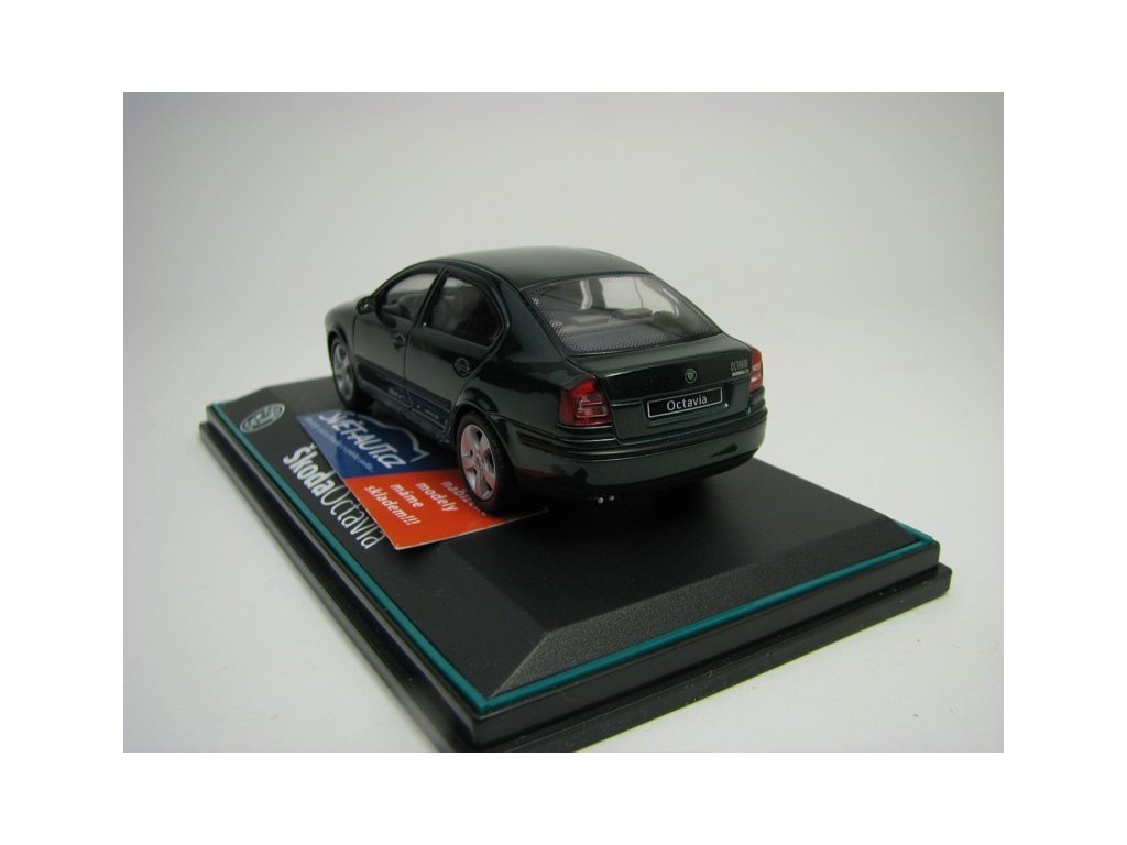 Kovový model Škoda Octavia 2004 H Green Natural Metallic 1:43 Abrex. Model je dodáván v plastové vitrínce na podstavci, ke kterému je přišroubován. Délka modelu je 10 cm.