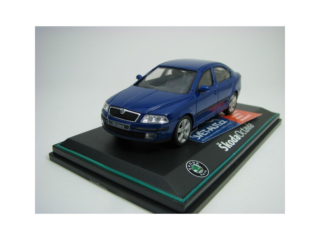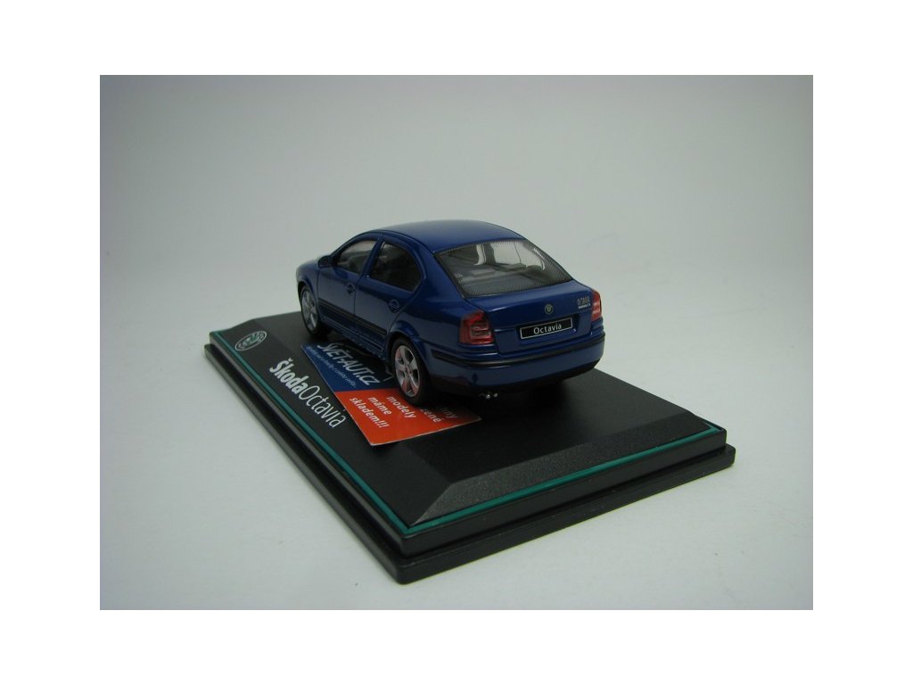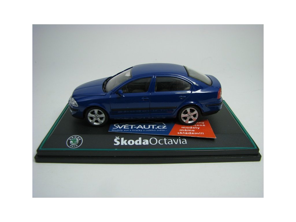 Kovový model Škoda Octavia 2004 L blue dynamic uni 1:43 Abrex. Model je dodáván v plastové vitrínce na podstavci, ke kterému je přišroubován. Délka modelu je 10 cm.