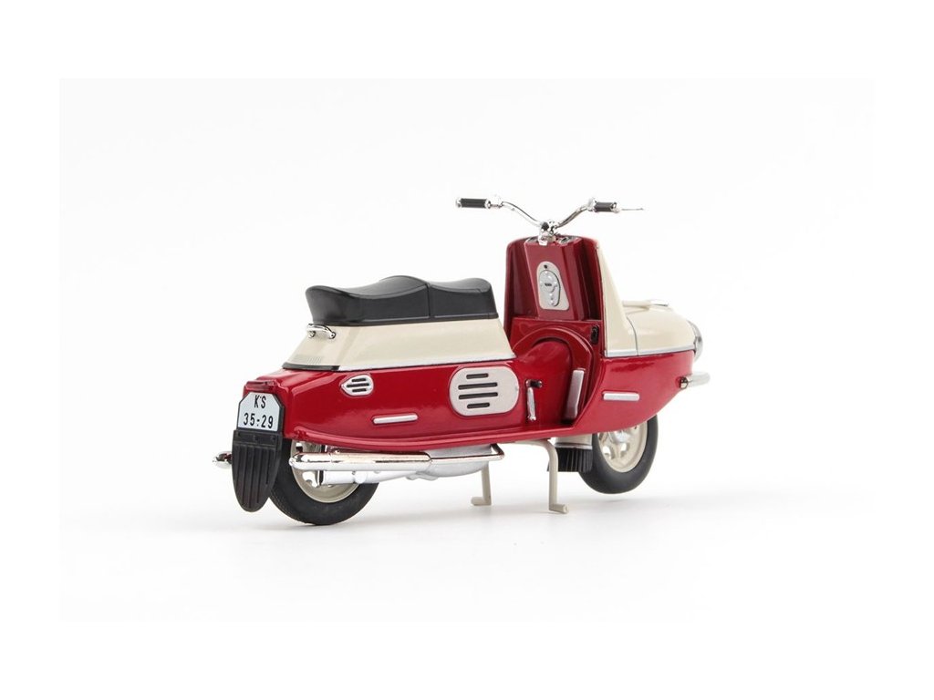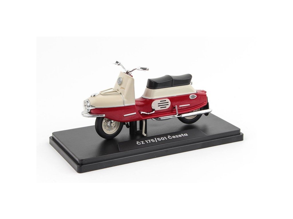 Skůtr Čezeta ČZ 175/501 1958 Tmavě Červená/Světle Šedá 1:18 Abrex. ČZ 175/501 Čezeta byl slavný dvoumístný skůtr s velice avantgardním designem, který byl vyvinut Českou zbrojovkou Strakonice (počáteční vývoj tohoto skůtru byl zahájen už v roce 1950 v českobudějovické České zbrojovce). Jeho prototyp spatřil světlo světa v roce 1956 a jeho první série, sčítající 300 kusů, vznikla o rok později. Tento obdivovaný a nesmírně žádaný motocykl se vyráběl od roku 1957 do roku 1960 a následně byl nahrazen modernizovaným typem ČZ 175/502 Čezeta. Fota a text Abrex.