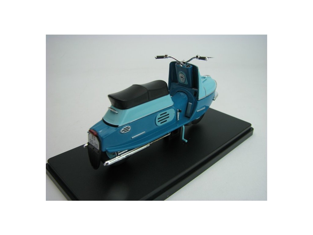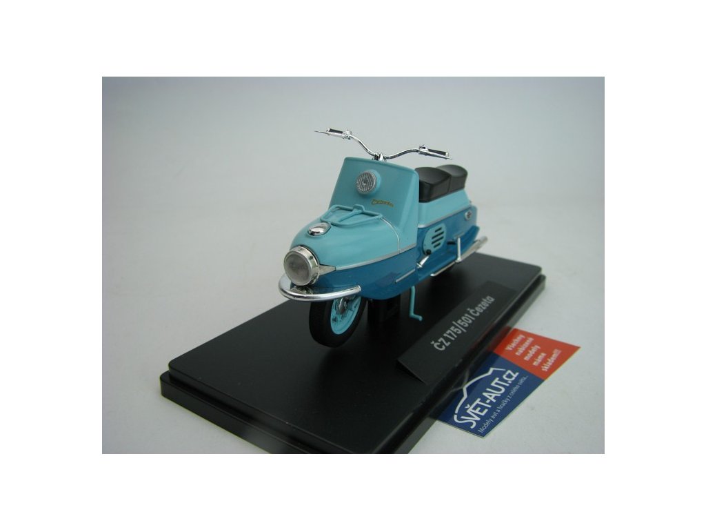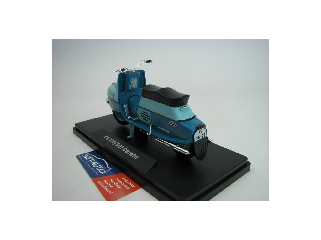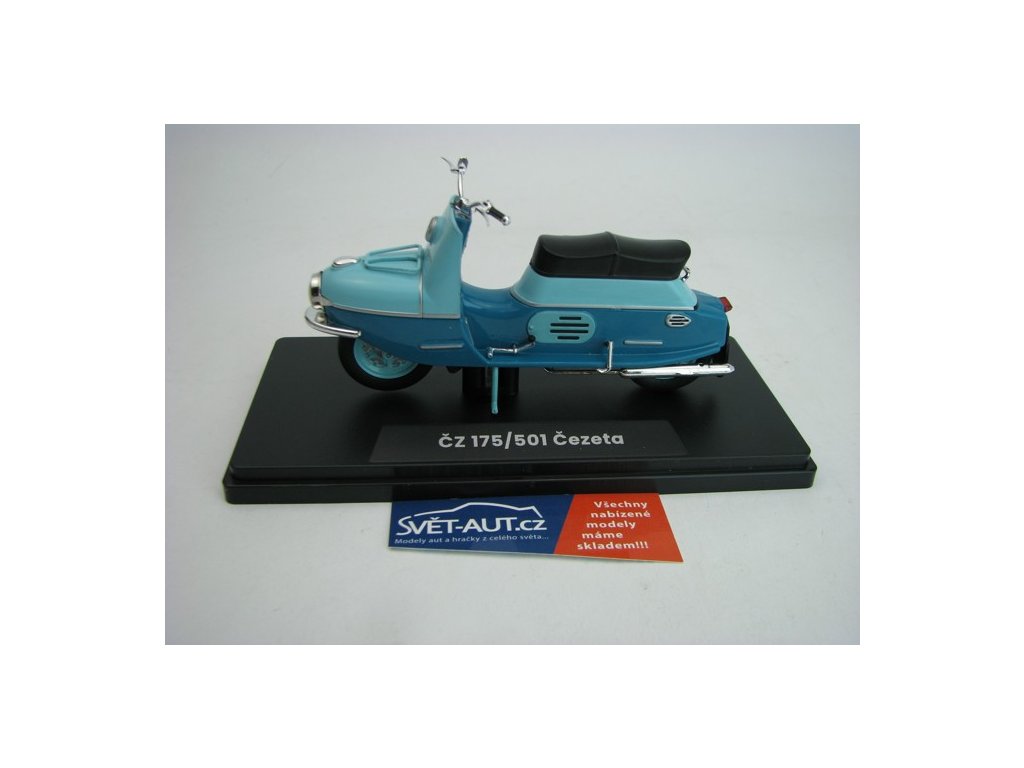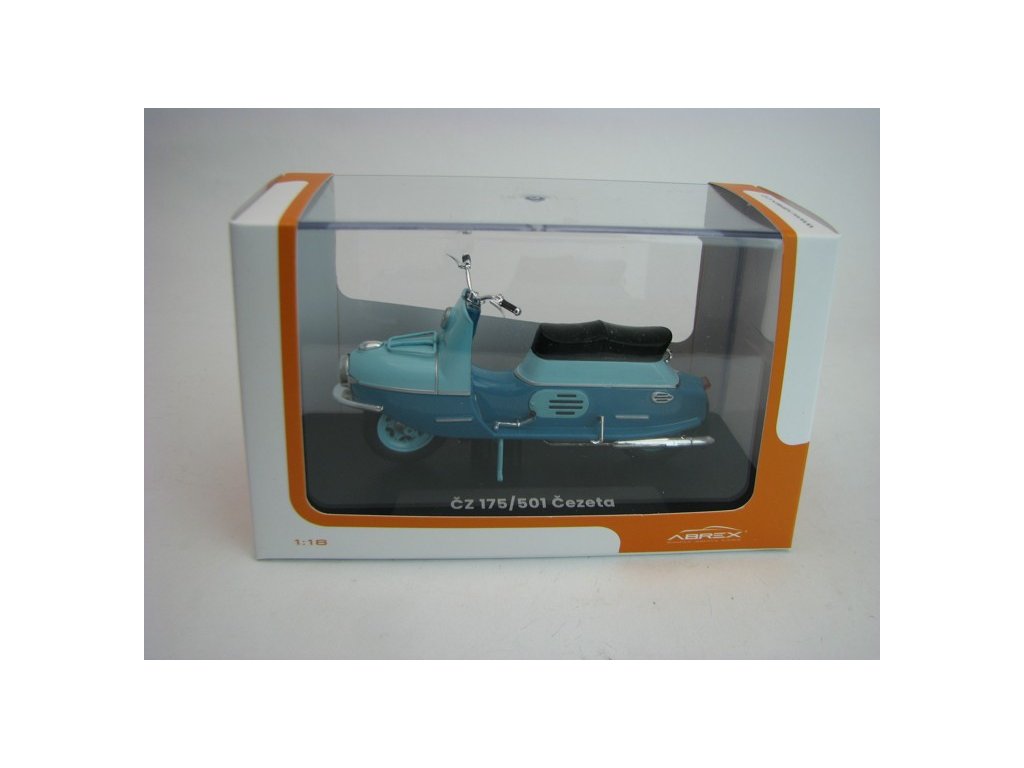 Skůtr Čezeta ČZ 175/501 1958 Tyrkysová/tmavá Tyrkysová 1:18 Abrex. ČZ 175/501 Čezeta byl slavný dvoumístný skůtr s velice avantgardním designem, který byl vyvinut Českou zbrojovkou Strakonice (počáteční vývoj tohoto skůtru byl zahájen už v roce 1950 v českobudějovické České zbrojovce). Jeho prototyp spatřil světlo světa v roce 1956 a jeho první série, sčítající 300 kusů, vznikla o rok později. Tento obdivovaný a nesmírně žádaný motocykl se vyráběl od roku 1957 do roku 1960 a následně byl nahrazen modernizovaným typem ČZ 175/502 Čezeta. Text Abrex. 118M-2003