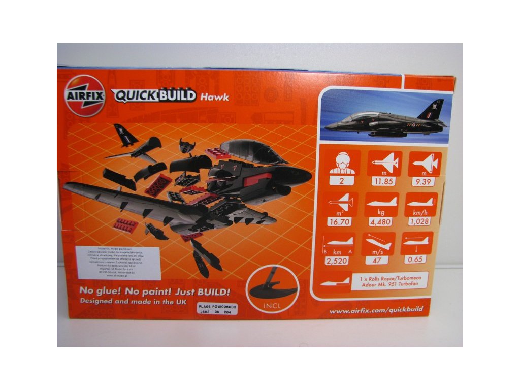 Airfix QUICK BUILD je úžasná řada jednoduchých zacvakávacích modelů, která poslouží jako naprosto perfektní úvod do světa modelářství pro děti (starší než 5 let), ale také jako ta pravá kratochvíle i pro zkušenějšího modeláře. Plastiková stavebnice typu Lego bez použití lepidla. Stavebnice Quick-Build Hawk Airfix J6003. Předbarvené díly lze jednoduše zacvaknout do sebe, nic není potřeba lepit ani barvit, a v mžiku se před Vámi objeví opravdu působivý model, který můžete navíc vylepšit podle svých představ pomocí přiložených samolepicích obtisků. S modely letadel najdete v balení samozřejmě také stojánek pro vystavení vašeho výtvoru, abyste se s ním mohli náležitě pochlubit! Celá řada QUICK BUILD se vyrábí ve Velké Británii a nabízí Vám některé z těch nejikoničtějších vozidel či letadel, jaké byly kdy postaveny! Rozpětí: 180 mm, Délka: 221 mm, Počet dílů: 26.Doplňkové parametry
