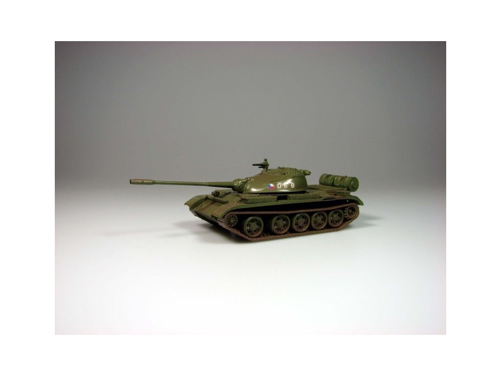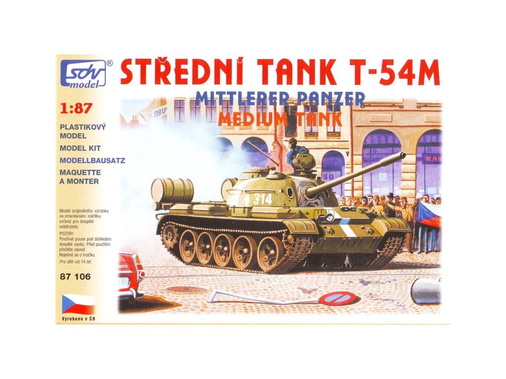 Plastiková stavebnice Střední tank T-54M 1:87 SDV. Stavebnice je lisována v barvách modelu a součástí jsou i potisky. Není nutné ji tedy stříkat, nebo natírat. Lepidlo ani barvy nejsou součástí stavebnice.