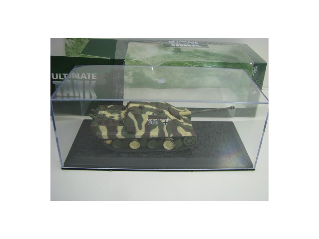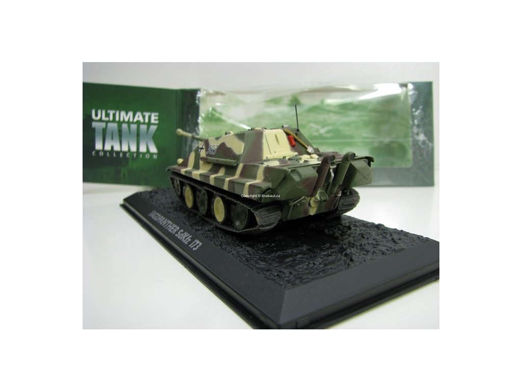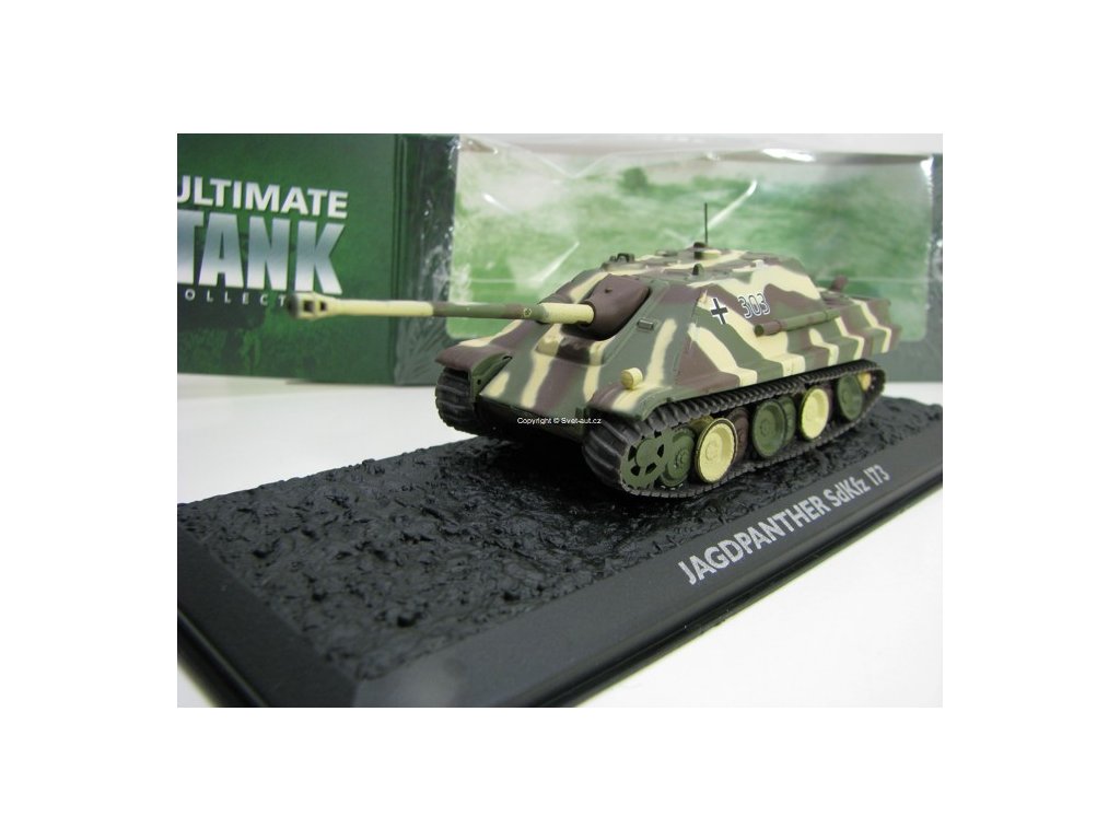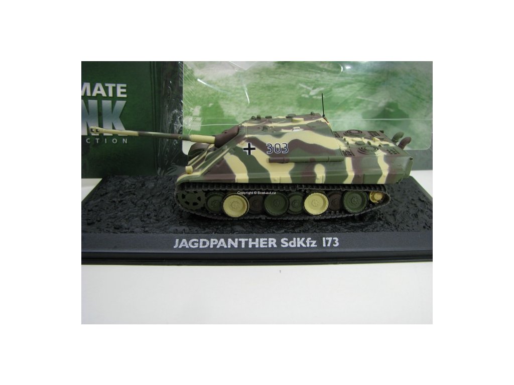 Kovový model s plastovými díly. Tank Jagdpanther SdKfz 173 1:72 Ultimate tank Collection Atlas. Délka modelu je 13,5 cm. Model je na podstavci v plastové vitrínce o rozměrech délka 17,5 cm, šířka 7,5 cm, výška 6,8 cm.