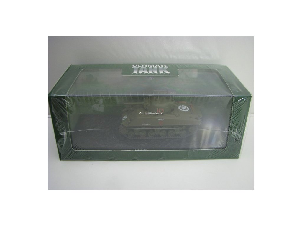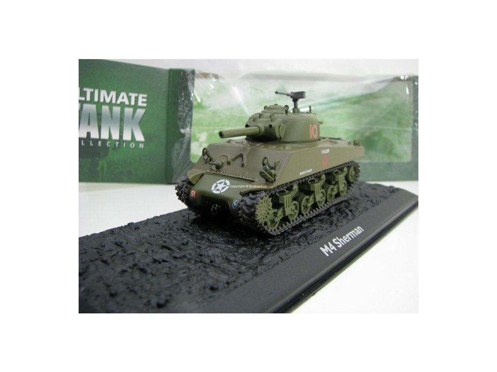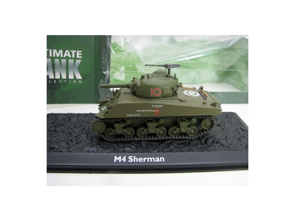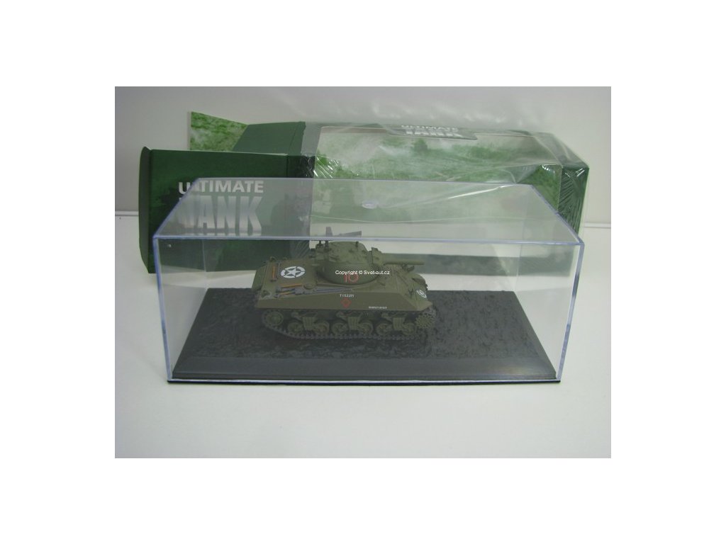 Kovový model s plastovými díly. Tank M4 Sherman 1:72 Ultimate tank Collection Atlas. Délka modelu je 8,2 cm. Model je na podstavci v plastové vitrínce o rozměrech délka 17,5 cm, šířka 7,5 cm, výška 6,8 cm.