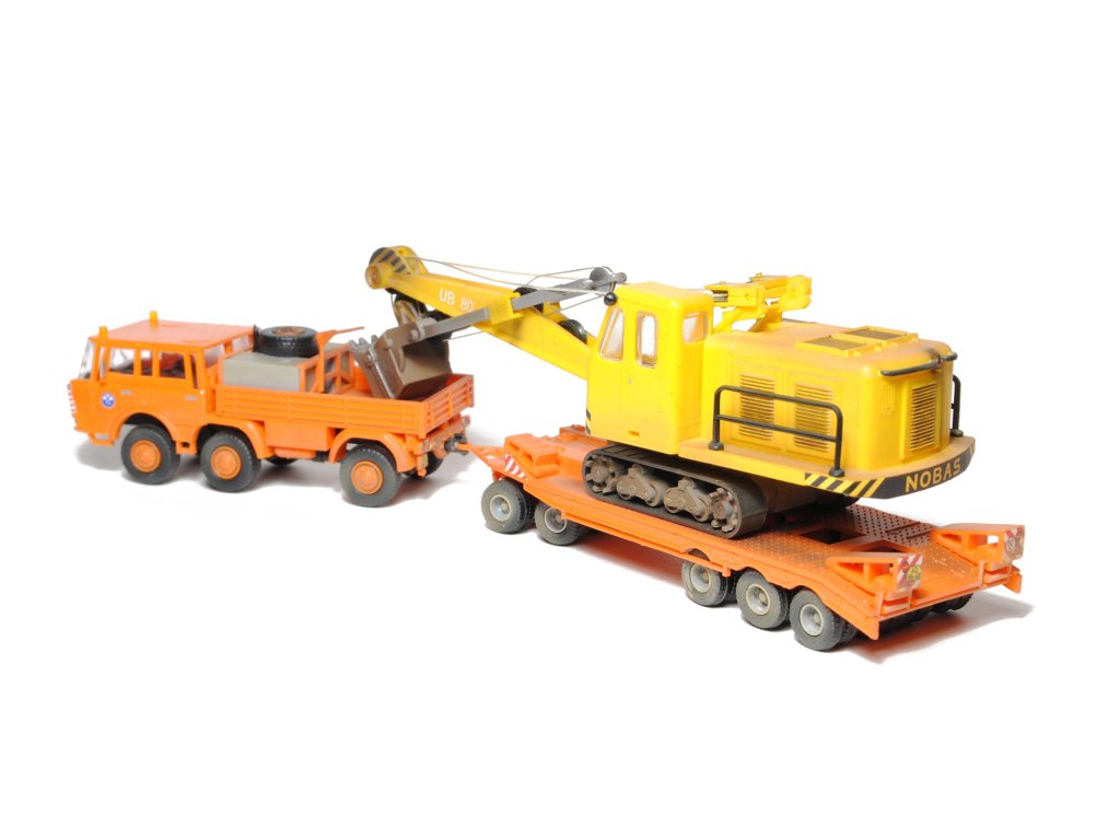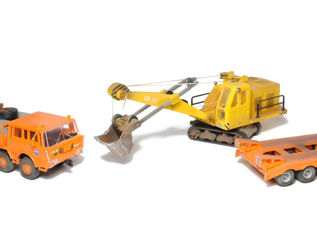 Kompletní plastiková stavebnice Tatry 813 6×6 TP, podvalníku P-50 a bagru Nobas 80. Obsahuje probarvené plastikové výlisky na sestavení modelů, majáky, kovové osičky a sadu obtisků.