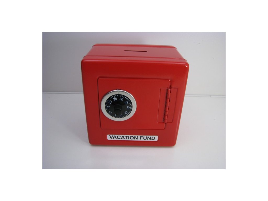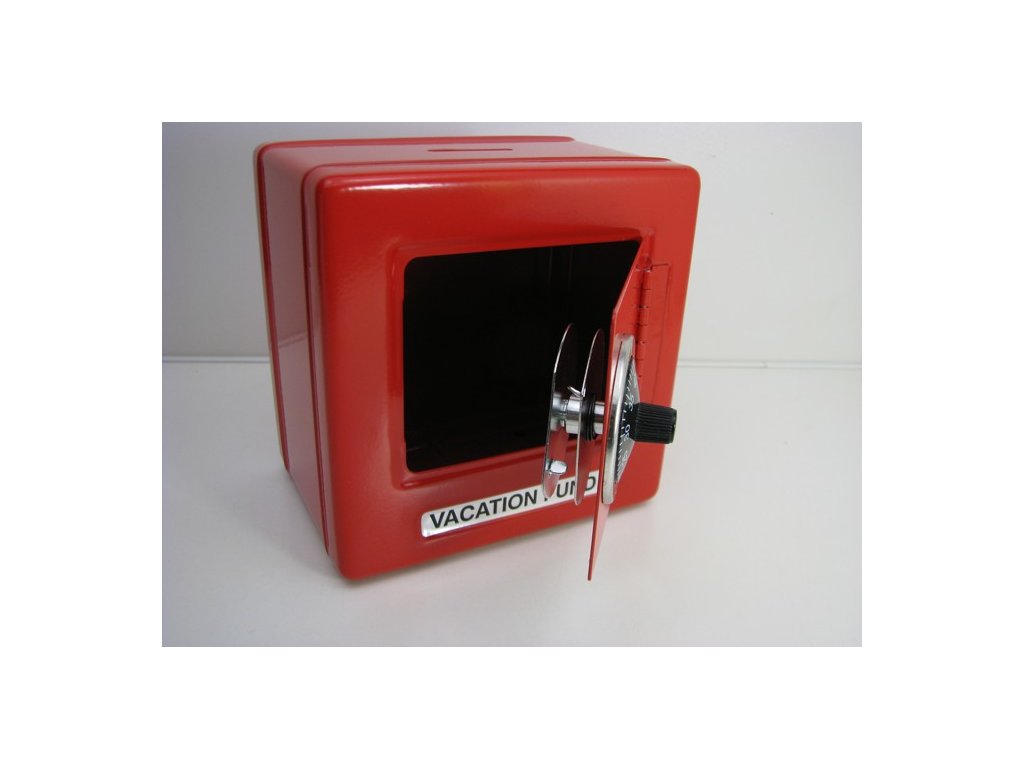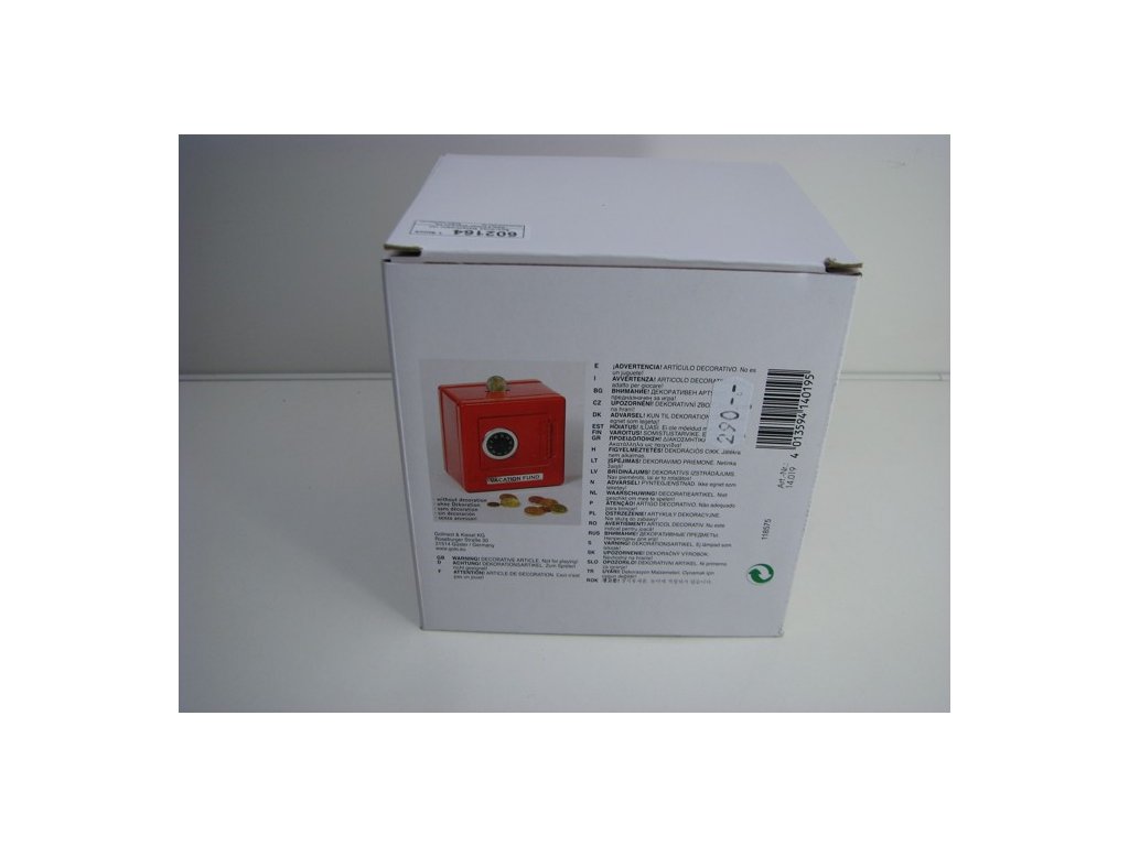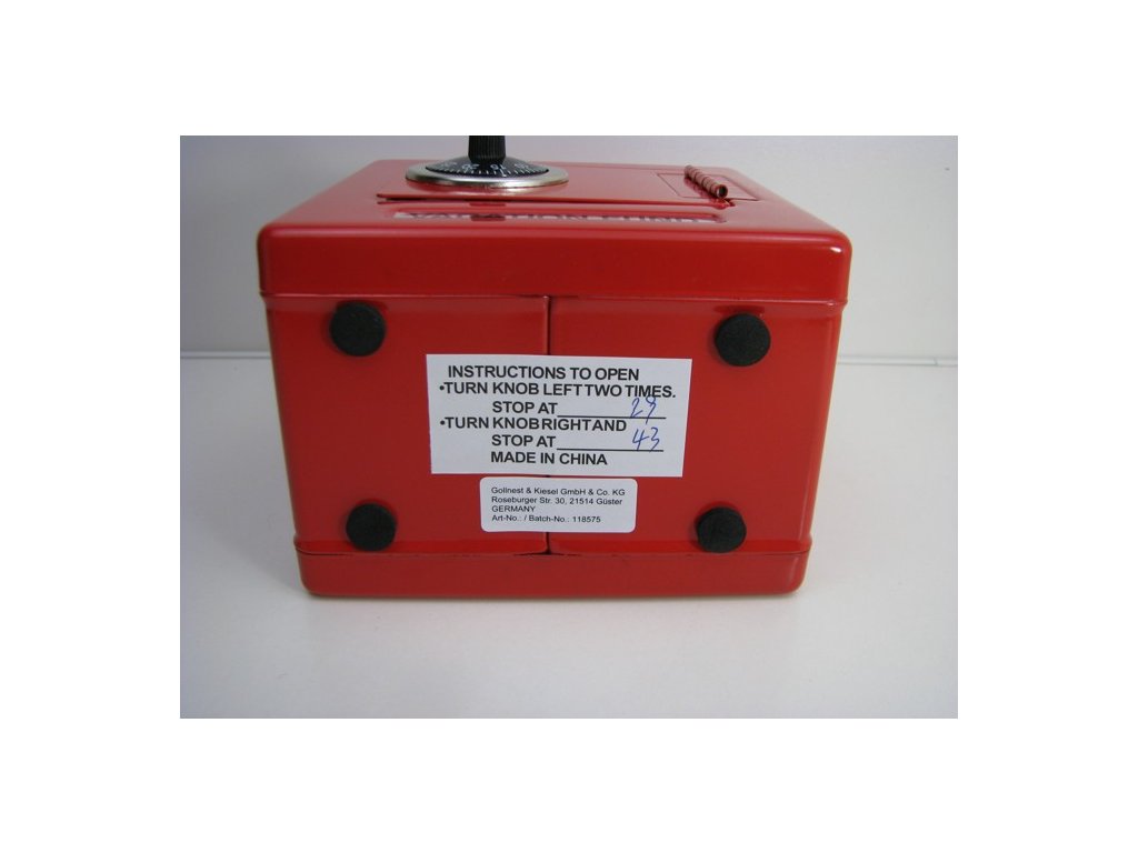 Trezor červený plechová kasička plechové hračky Germany. Výška 13 cm, délka 13 cm, šířka 11 cm. Sběratelský model od 14 let, není certifikováno jako hračka.