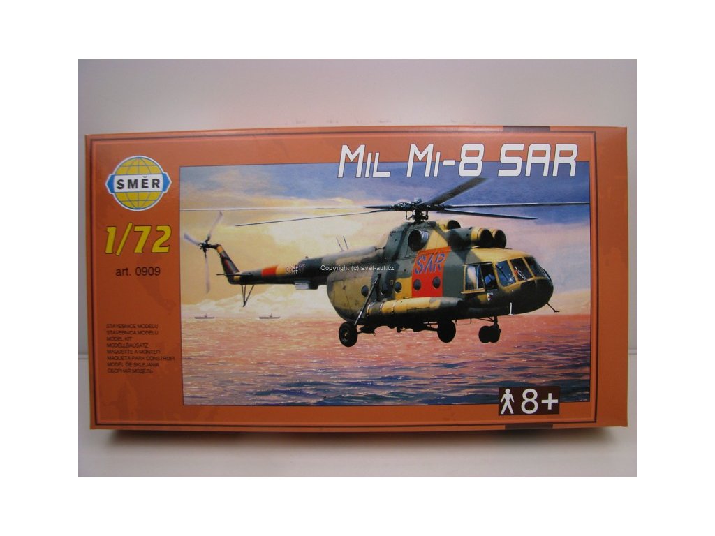 Plastiková stavebnice na slepení. Vrtulník Mil Mi-8 SAR 1:72 Směr 0909. Délka postaveného modelu je 23 cm. Průměr vrtulových listů je 29 cm. Stavebnice obsahuje díly z původních forem Kovozávody Prostějov.